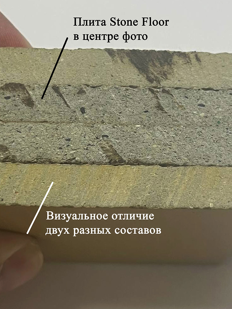 С помощью этих фотографий вы можете увидеть, что все использованные материалы имеют разную формулу своего состава. Помните, что все искусственные материалы отличаются друг от друга и имеют разные свойства. Одни и те же характеристики только на упаковке не будут являться гарантией того, что полы поведут себя одинаково в идентичных условиях. Проверяйте СЕРТИФИКАТЫ и не только их наличие, но и полученные в результате испытаний показатели. Дженерики имеют другие свойства и физически не могут на 100 % соответствовать характеристикам Stone Floor.